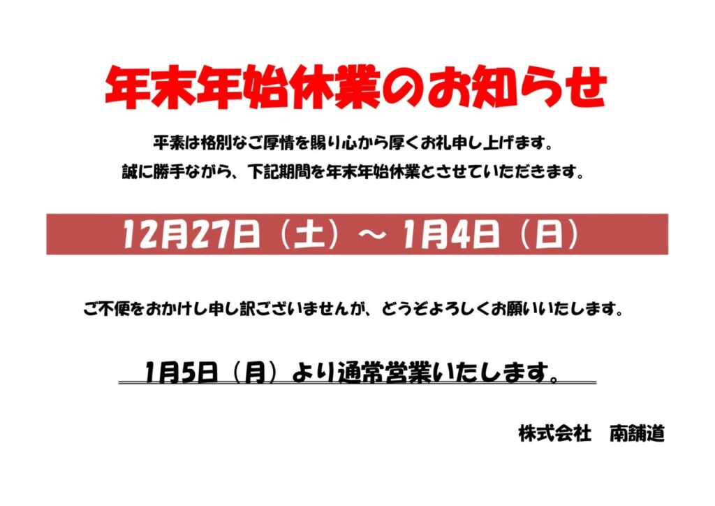 12月27日(土)~1月4日(日)まで年末年始休業となります。