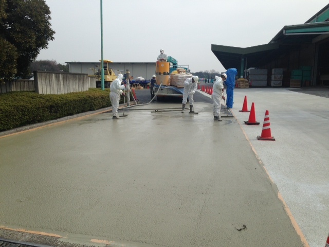 セメントミキサーを用いて水で撹拌し、開粒度アスコンの空隙にセメントミルクを流し込んで浸透させ、アスファルト舗装のたわみ性とコンクリート舗装の剛性を併せ持たせた「半たわみ性舗装」です。耐荷重性、耐摩耗性、耐熱性、耐流動、景観性などを持たせることもが可能です。