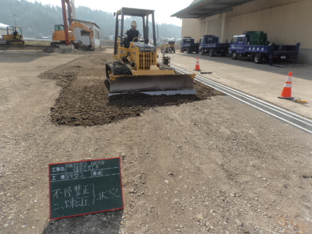 舗装の出来ばえは下地に決まります。なので入念に施工し下地の小波による修正・高陸の調整をモーターグレーダーにて均等かつ丁寧に敷き均します。