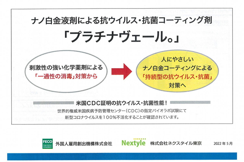 抗ウイルス・抗菌コーティング剤の「プラチナヴェール。」は、主成分が白金ナノ粒子合成材であることが特徴で、安全性・即効性・持続性にも長けています。 白金の強力な触媒作用で有機物(臭い・菌類・ウイルス・VOCガスなどの有害物質)を酸化分解することが出来、腐食・変色なく素材を選ばすにコーティングが出来ます。 米国CDCにおいても新型コロナウイルスを不活化することが確認されており、学校・商業施設・飲食店・病院・保育園・映画館など様々な場所で導入が進んでいます。